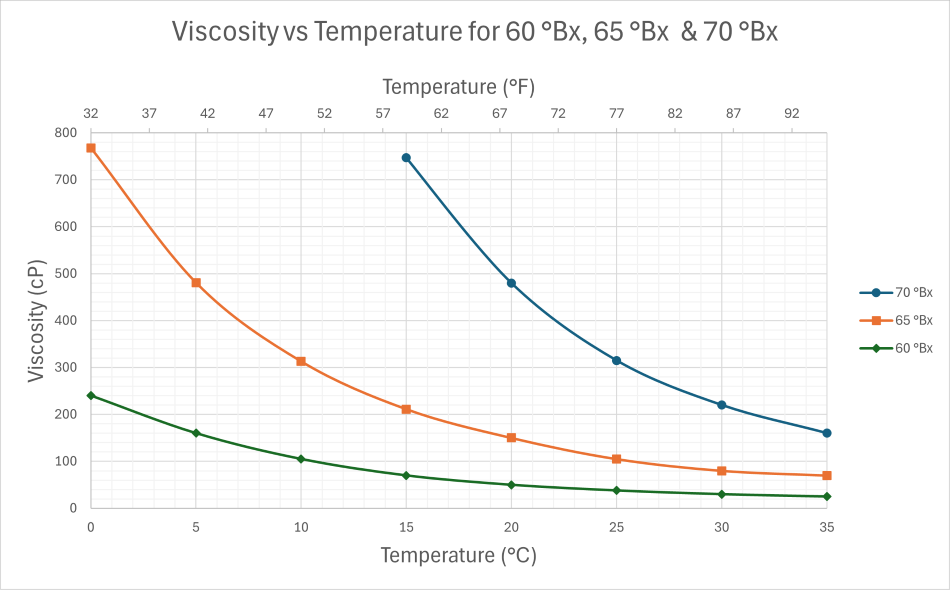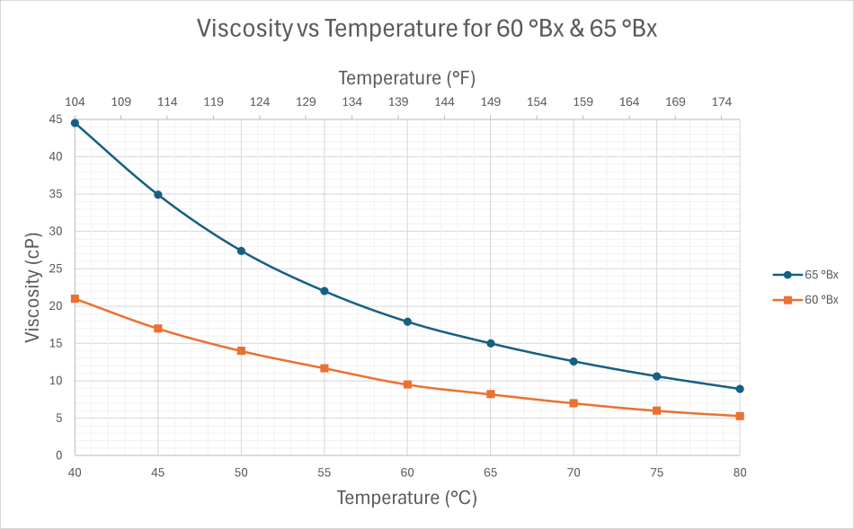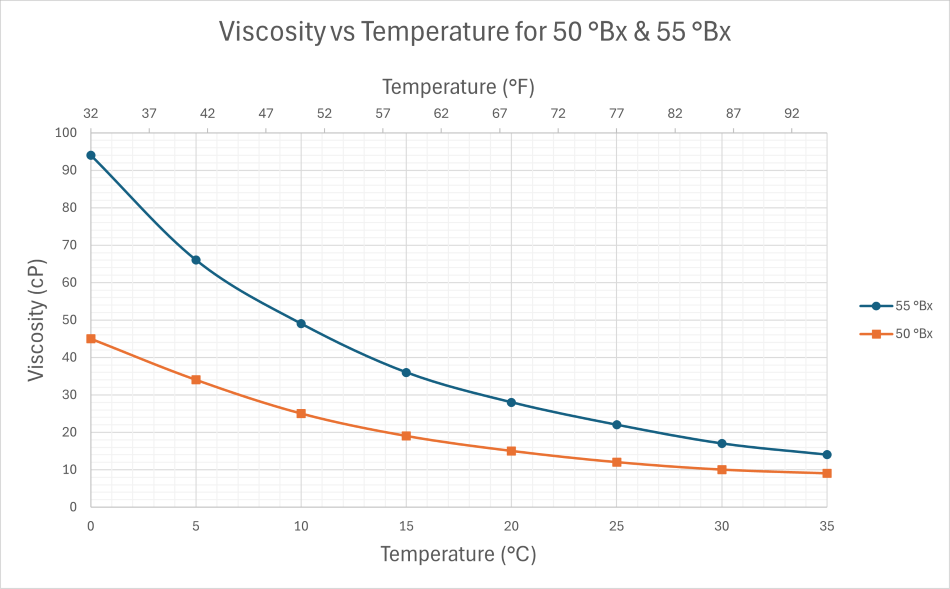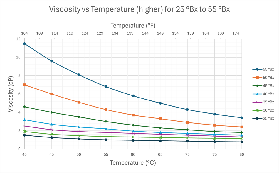 - The following charts represent the value of viscosity of sucrose solution in centipoise (cP) at various temperature for various Brix values.